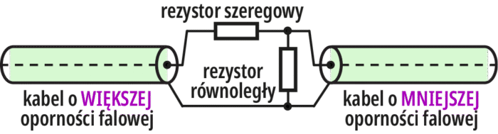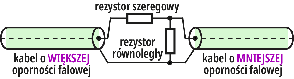 Przypominam, że do uzyskania pełnego dopasowania falowego danego kabla (linii transmisyjnej, linii długiej), czyli do zachowania „ulubionego przez ten kabel” stosunku E / H czyli U / I, należy zapewnić ciągłość impedancji na obu jego końcach. Kabel „musi widzieć z obu stron” impedancję równą jego impedancji (rezystancji charakterystycznej). Można to uzyskać w dowolny sposób, także bez rezystorów i bez transformatora.