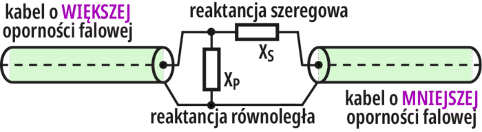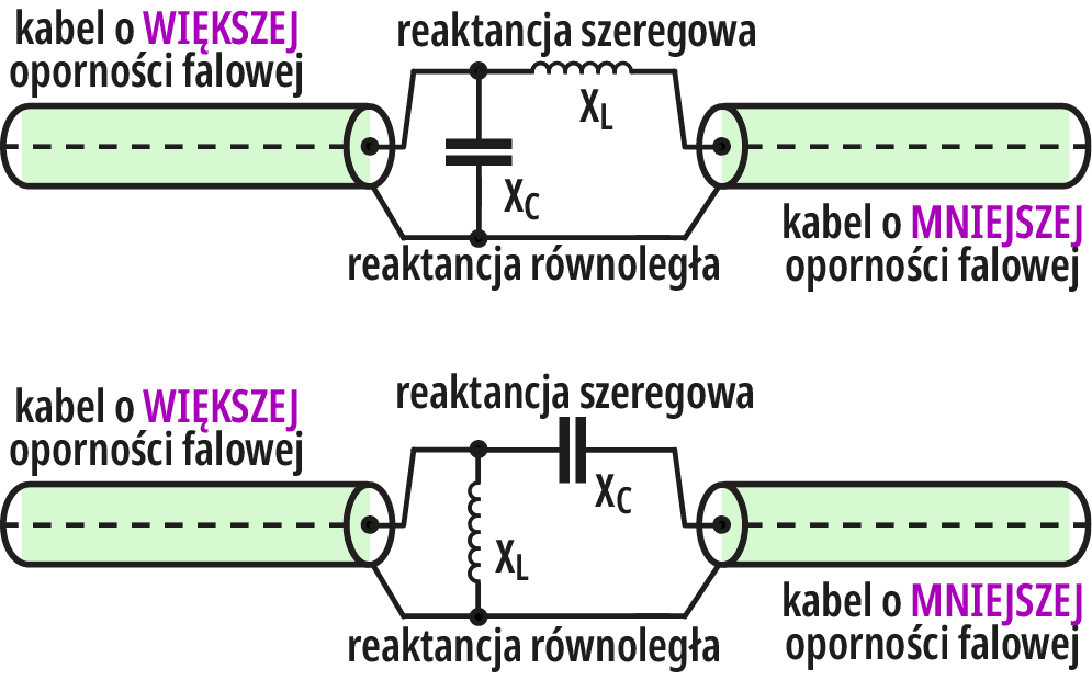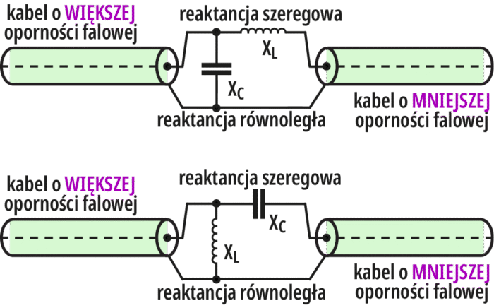 Teraz do dopasowania falowego zamiast rezystancji chcemy wykorzystać reaktancję, według rysunku 2. Zaskakujące jest to, że konfiguracja takiego reaktancyjnego obwodu typu L, jest niejako odwrotna niż przy wykorzystaniu rezystorów! Do dyspozycji mamy reaktancję pojemnościową kondensatora (XC) i reaktancję indukcyjną cewki (XL). Co ogromnie ważne, w (idealnych) cewkach i kondensatorach nie występują straty mocy, więc teoretycznie taki sposób dopasowania falowego jest bezstratny.