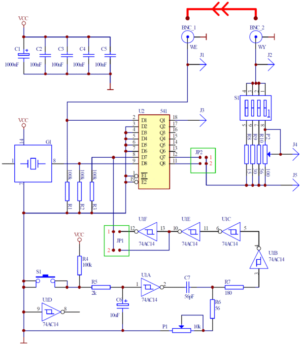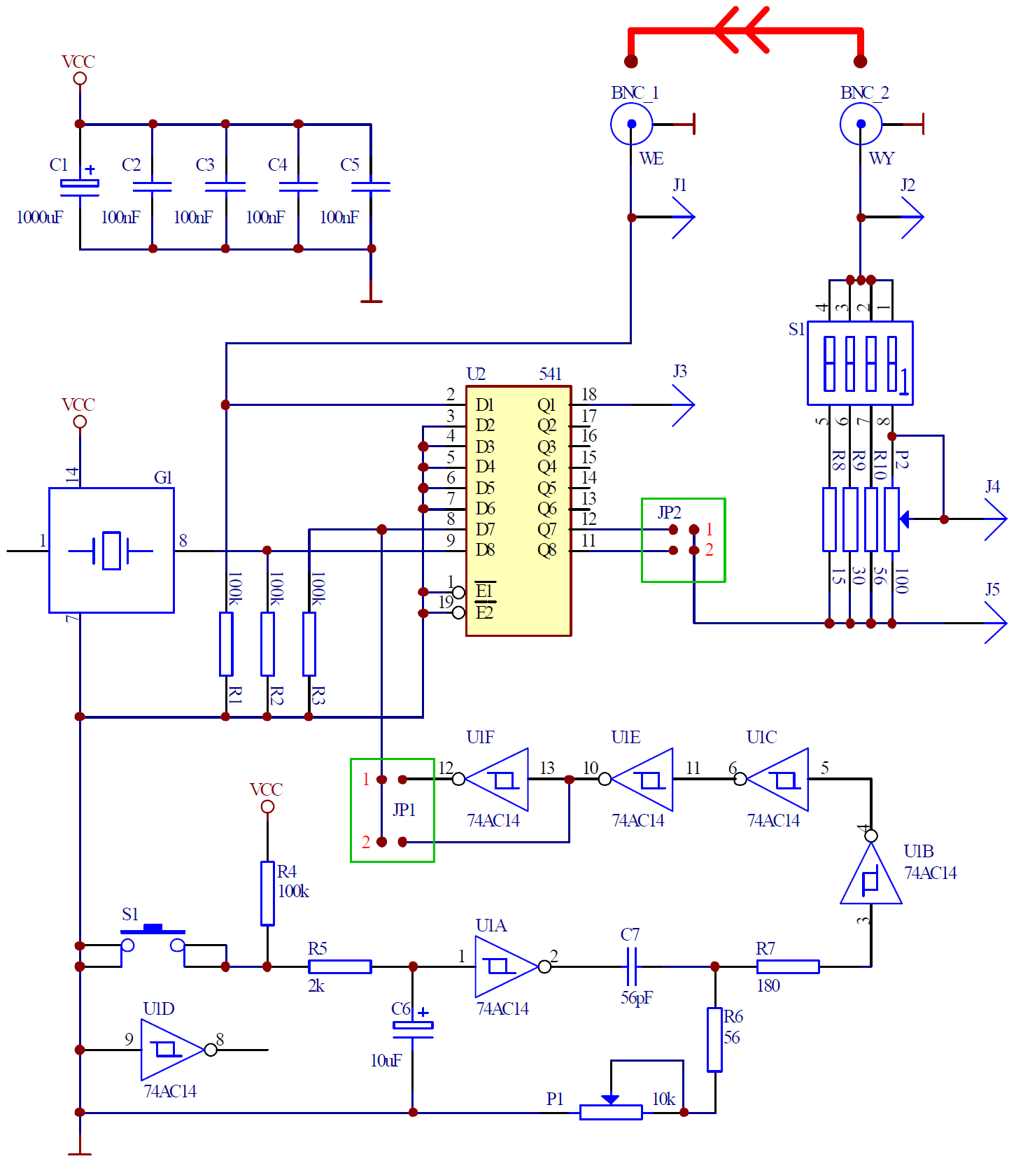 Obwód wykorzystujący układ 74AC14 służy do generowania, krótkich impulsów prostokątnych o stromych zboczach. Przyciskiem S1 wywołujemy krótki impuls szpilkowy. Przycisk ten jest podłączony do obwodu eliminującego drgania styków składających się z elementów R4, R5 oraz C6. Rezystor R5 dodatkowo ogranicza prąd ładujący kondensator C6. Stała czasowa obwodu R4+R5C6 jest asymetryczna. Wynosi w przybliżeniu 20 ms lub 1 s. Obwód ten okazał się niezbędny, bo zdarzały się nieprawidłowe sytuację, a ja chciałem mieć wygenerowany tylko i wyłącznie pojedynczy impuls.