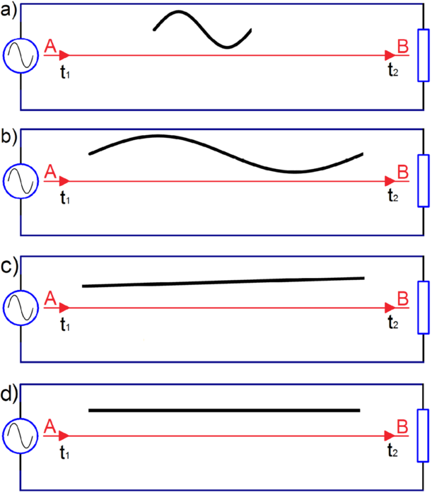 Bardziej intuicyjne dla określenia wartości napięć i prądów występujących na zaciskach źródła i obciążenia są rysunki 1b, 1c i 1d. Po dotarciu energii EM do obciążenia możemy zauważyć, że im większa długość fali λ przebiegu sinusoidalnego lub krótsza linia transmisyjna w stosunku do tej fali przebiegu, tym mniejsza jest różnica napięć i prądów występujących między źródłem a odbiornikiem. Przyjmujemy przy tym, że co najmniej obciążenie jest dopasowane falowo do linii transmisyjnej.