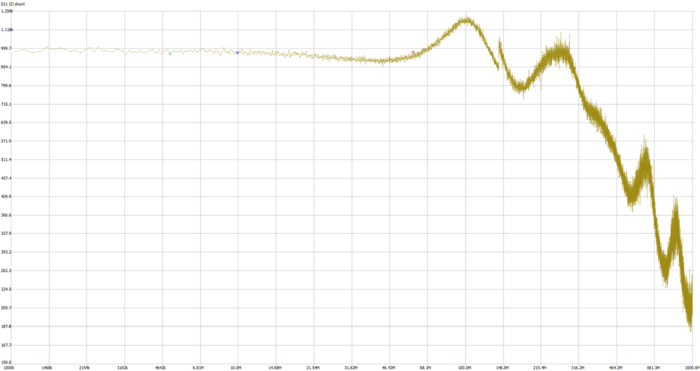 Pragnę na początku przypomnieć, że oscylogramy przedstawione w tym odcinku wykonane są za pomocą bardzo prostej sondy rezystancyjnej, o tłumieniu 21:1 (chyba, że napisano inaczej), ogólnikowo omówionej w poprzednim odcinku. W związku z tym wszystkie wartości napięć na działkę należy pomnożyć dla ułatwienia przez dwa. Na rysunku 1  przedstawiona jest impedancja tej sondy w dziedzinie częstotliwości. Pomiar został wykonany przyrządem NanoVNA, uprzednio poddanym pięciostopniowej kalibracji. W związku z czym, pomiar został przeprowadzony za pomocą sieci dwuportowej.