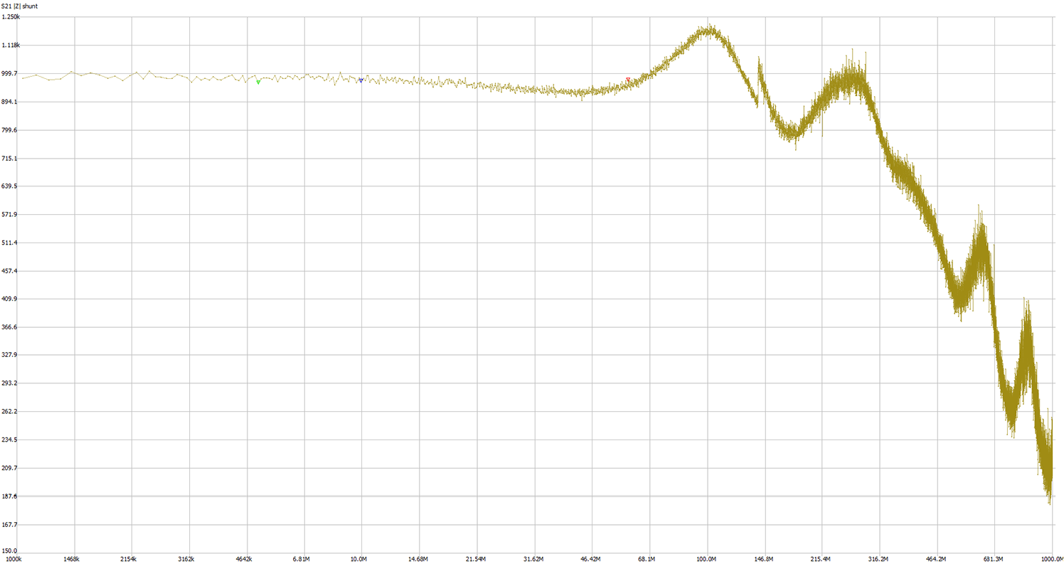 Pragnę na początku przypomnieć, że oscylogramy przedstawione w tym odcinku wykonane są za pomocą bardzo prostej sondy rezystancyjnej, o tłumieniu 21:1 (chyba, że napisano inaczej), ogólnikowo omówionej w poprzednim odcinku. W związku z tym wszystkie wartości napięć na działkę należy pomnożyć dla ułatwienia przez dwa. Na rysunku 1  przedstawiona jest impedancja tej sondy w dziedzinie częstotliwości. Pomiar został wykonany przyrządem NanoVNA, uprzednio poddanym pięciostopniowej kalibracji. W związku z czym, pomiar został przeprowadzony za pomocą sieci dwuportowej.