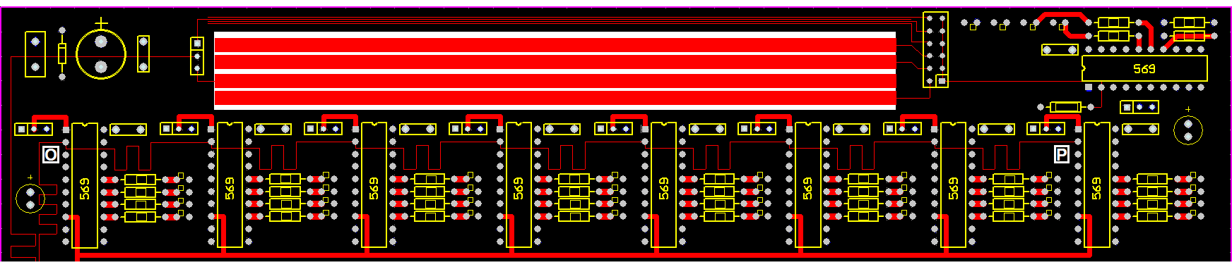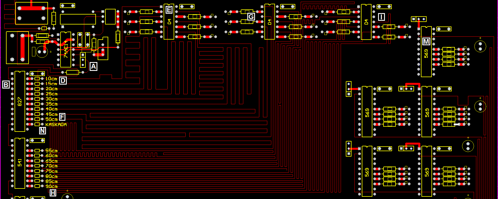 Rysunek 2, 3 oraz 4 przedstawiają topologię połączeń płytki PCB na warstwie TOP. Białe litery w kwadratowych ramkach od [A] do [P] są znacznikami, gdzie wykonywany był pomiar parametrów.