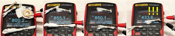 Otóż ogniwa zawierające jako elektrody miedź i cynk bez obciążenia dają napięcie ponad 700 mV (0,7 V). Na fotografii podkładki oraz „ogniwo śrubowe” z dłuższym wkrętem dają prawidłowe napięcie nawet ponad 800 mV. Jedno z krótszych „ogniw śrubowych” też daje prawidłowe napięcie 850,1 mV, natomiast na ostatnim ujęciu widać, że bardzo podobne ogniwo daje tylko 433,6 mV! Długość wkrętów nie ma tu żadnego znaczenia. Najprawdopodobniej w tym ostatnim wkręcie jest jakiś kłopot z niejednorodną lub zanieczyszczoną warstwą cynku, pokrywającego stalowy wkręt.
