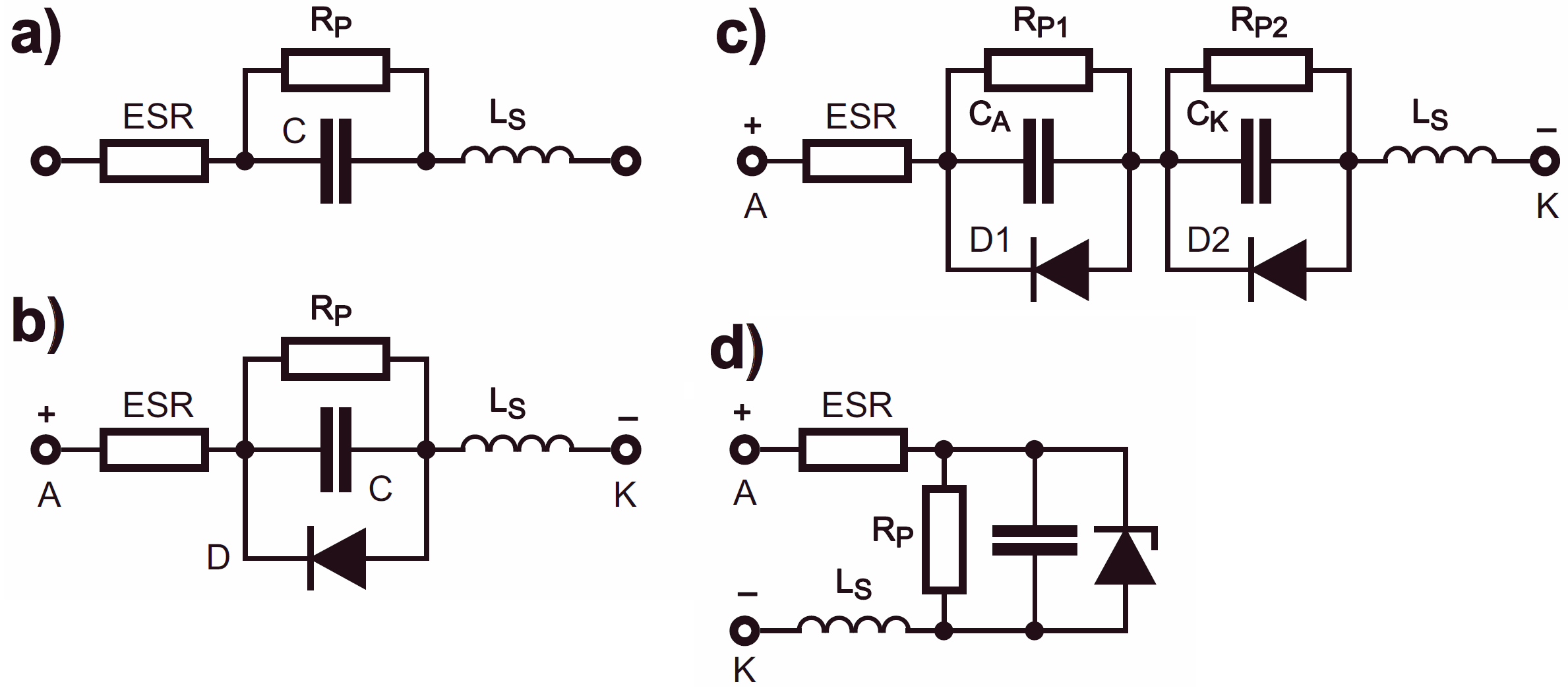 Można też spotkać wersje schematu zastępczego z diodą, jak na rysunku 1b, z dwoma pojemnościami składowymi (rysunek 1c) i z diodą Zenera o napięciu przebicia wyższym od napięcia nominalnego kondensatora (rysunek 1d). Użycie symbolu diody Zenera odzwierciedla fakt, że po zwiększeniu napięcia o prawidłowej biegunowości powyżej napięcia nominalnego, rozpoczyna się proces ponownego formowania, kiedy to płynie duży prąd (jonowy), zwiększa się grubość warstwy tlenku i wydziela się gazowy wodór. Charakterystyka prądowo-napięciowa kondensatora elektrolitycznego naprawdę przypomina charakterystykę diody Zenera – rysunek 2.