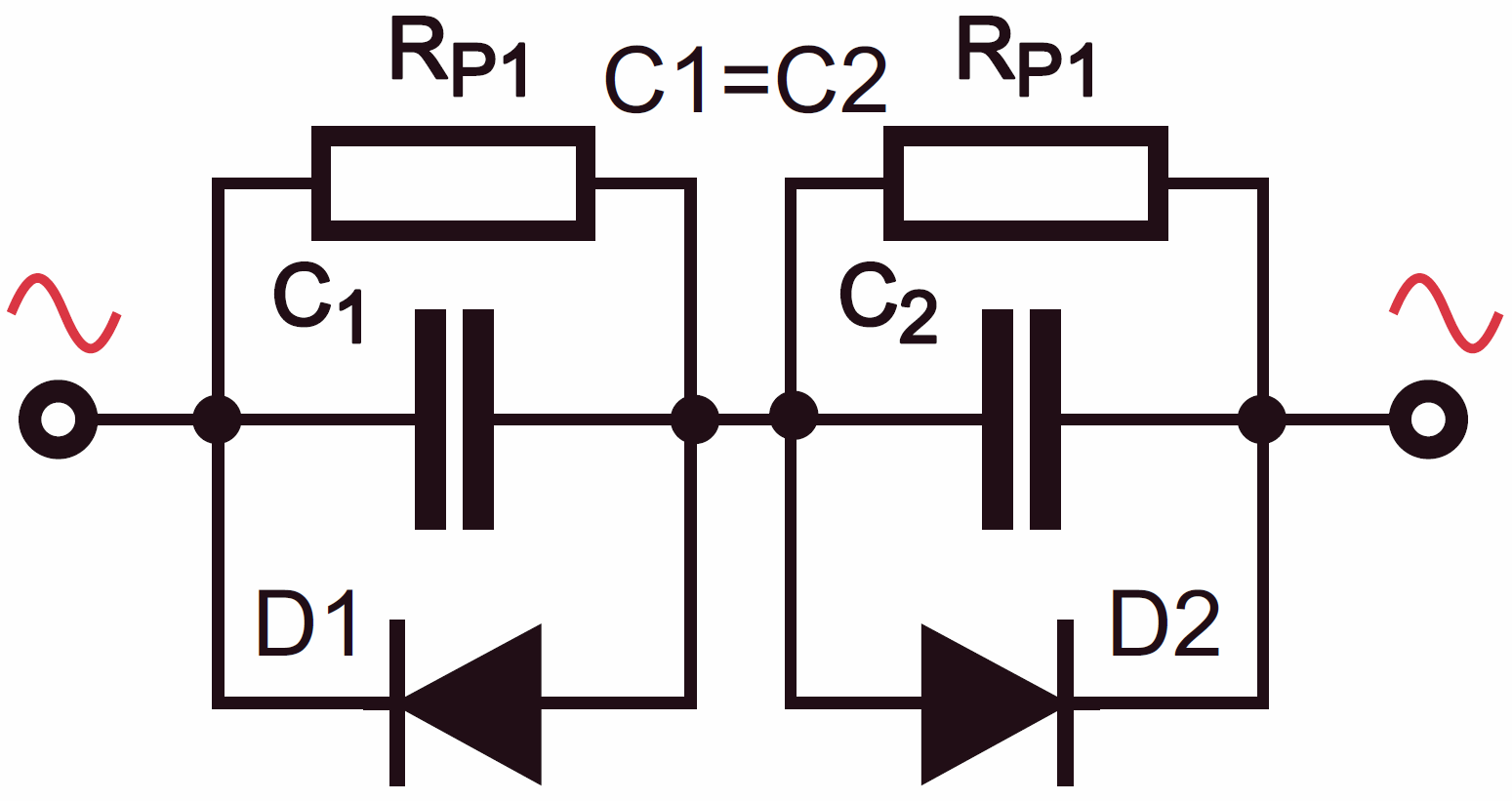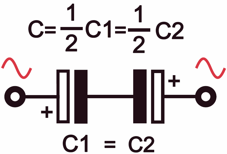 Warto jednak wiedzieć, że kondensator niebiegunowy można samodzielnie zrobić w prosty sposób, przez przeciwsobne połączenie szeregowe dwóch jednakowych kondensatorów biegunowych (katoda do katody, według rysunku 8).