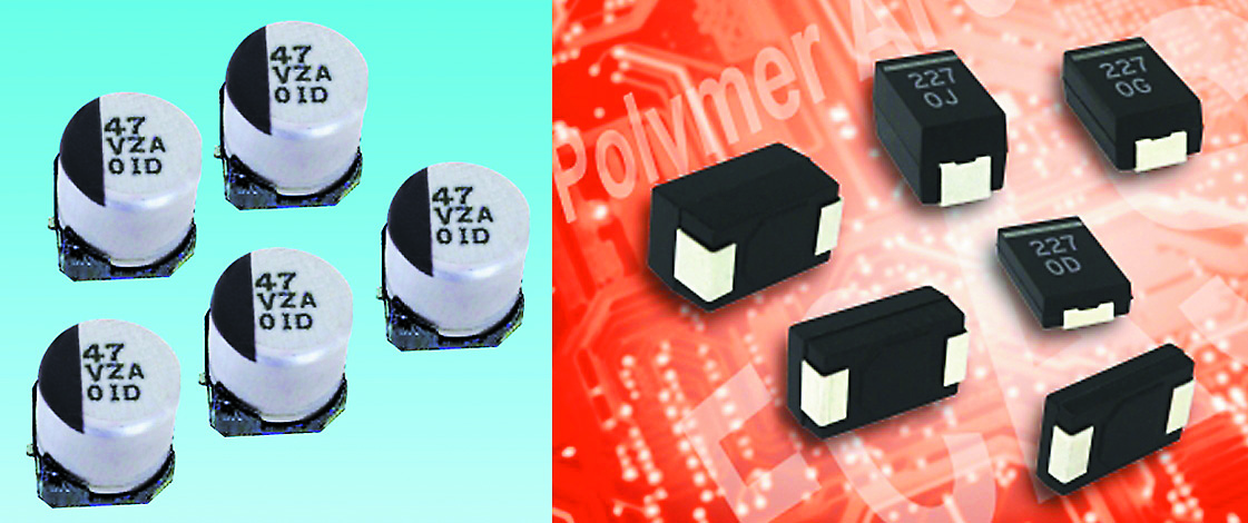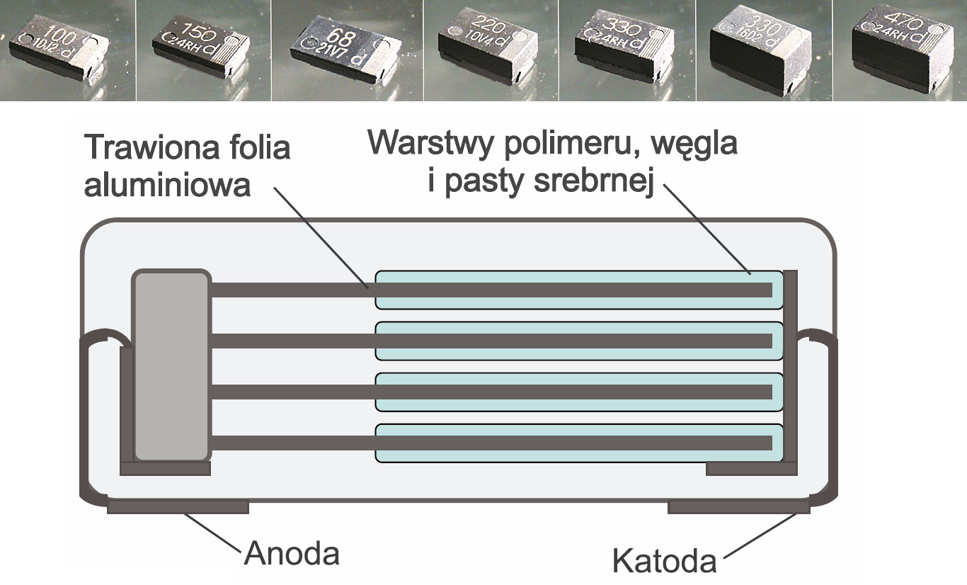 Od pewnego czasu na rynku obecne są kondensatory aluminiowe z elektrolitem polimerowym. Nazywane są często kondensatorami polimerowymi. Ich budowa jest dokładnie taka, jak wspomnianych właśnie kondensatorów ze stałym elektrolitem. Górna część Fotografii 10 przedstawia miniaturowe aluminiowe kondensatory polimerowe SMD Panasonic SP-Cap (Specialty Polymer Aluminum Electrolytic Capacitors). Ich wewnętrzna budowa pokazana jest na rysunku w dolnej części fotografii 10. Porowata powierzchnia paska trawionej, utlenionej folii aluminiowej wypełniona jest cieniutką warstewką polimeru, który stanowi właściwą katodę. Na nią przychodzi cienka warstewka węgla (grafitu) i pasty srebrnej, co stanowi doprowadzenie prądu do katody.