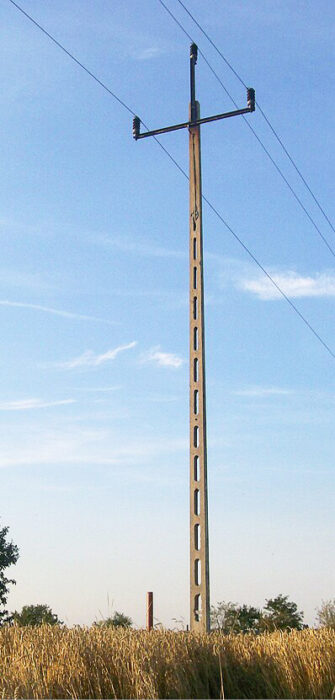 W odróżnieniu od słupów linii WN i NN, słupy linii SN i nN to zazwyczaj konstrukcje betonowe – konstrukcje kratowe stosowane są wyjątkowo, zazwyczaj w przypadku konieczności wykorzystania słupa o znacznej wysokości. Słupy betonowe to tzw. żerdzie. Dawniej powszechnie stosowane były żerdzie typu ŻN – fotografia 1 (Wikimedia Commons / Stefan.p21), strunobetonowe typu BSW.
