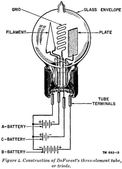 Budowę triody (z bezpośrednim żarzeniem) pokazuje stary rysunek 2. We współczesnych lampach zwykle katoda żarzona jest pośrednio i kształty poszczególnych składników lampy są inne, ale podstawowa zasada działania jest ta sama – bardzo prosta.