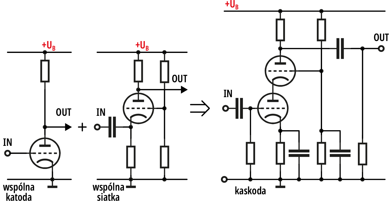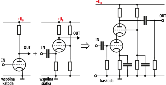 Ma natomiast pewien sens połączenie układów ze wspólną katodą oraz ze wspólną siatką. To jest tak zwany układ kaskodowy. Zapamiętaj, że kaskoda (nie kaskada) to połączenie układu ze wspólną katodą z układem ze wspólną siatką, według idei z rysunku 1.