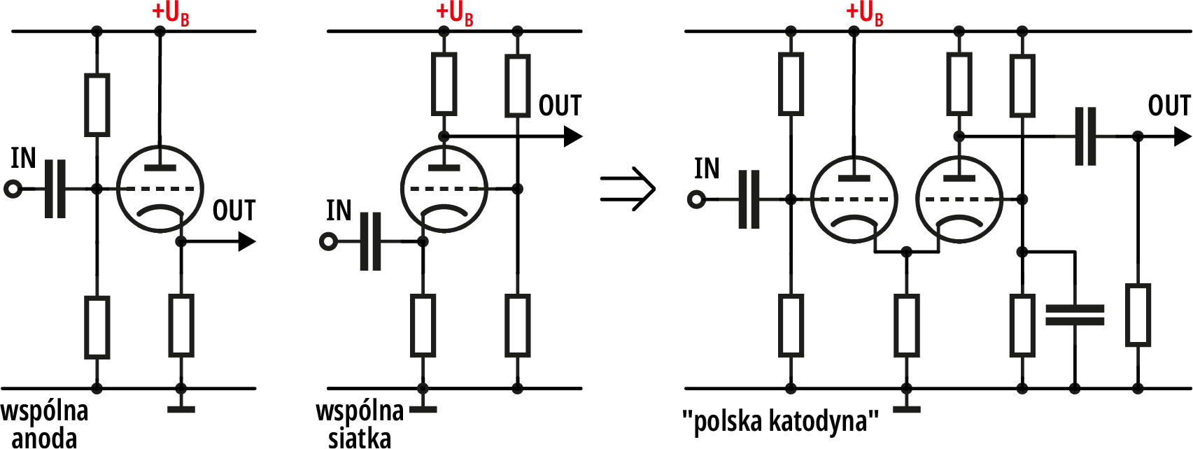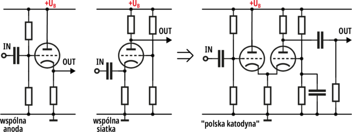 Z katodyną jest pewien problem. Otóż w źródłach polskich tak nazywa się połączenie układu wzmacniającego ze wspólną anodą (wtórnika) z układem ze wspólną siatką, według rysunku 2. W układach audio taka konfiguracja wzmacniająca nie ma istotnych zalet i jest rzadko spotykana.