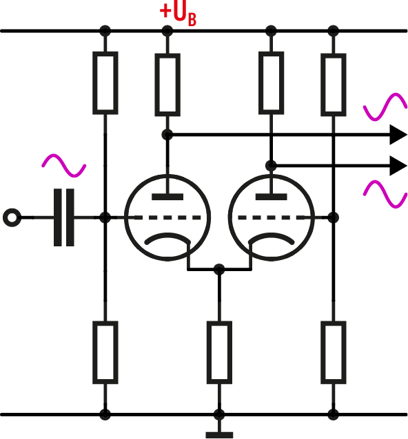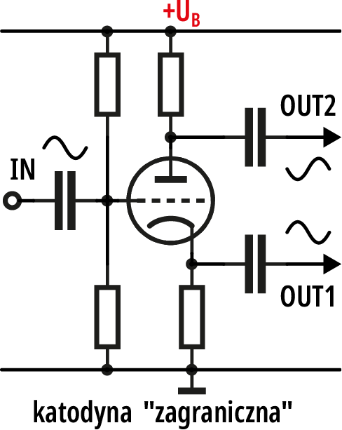 Natomiast w literaturze światowej katodyną nazywa się przede wszystkim układ z jedną lampą i dwoma wyjściami, według koncepcji z rysunku 3. Taka konfiguracja służy do uzyskania dwóch bliźniaczych sygnałów o jednakowej amplitudzie i przeciwnych fazach. W układach audio jest wykorzystywana w niektórych przeciwsobnych wzmacniaczach mocy (czyli push-pull) do wysterowania dwóch lamp w stopniu końcowym. Na pierwszy rzut oka wygląda na to, że w idealnym przypadku rezystory w obwodzie anody i katody powinny mieć identyczne wartości. W rzeczywistości rezystory te trzeba tak dobrać, żeby podczas pracy amplitudy sygnałów na obu wyjściach były jednakowe.
