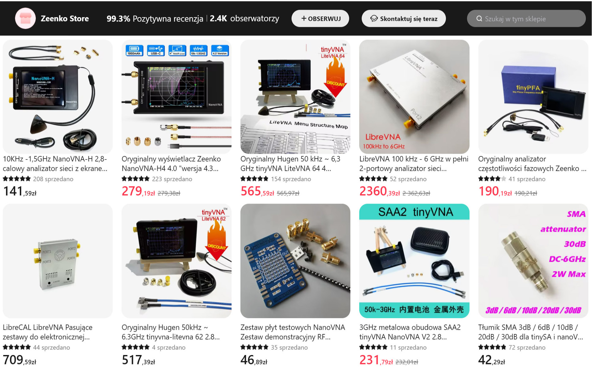 TLDR (too long; didn’t read), czyli najkrócej dla tych niecierpliwych, którzy chcą kupić, a nie czytać: zajrzyj do godnego uwagi chińskiego sklepu internetowego Zeenko, gdzie można znaleźć oferty różnych wersji nanoVNA w różnych cenach – rysunek 1. Ten sam sprzedawca (AURSINC) oferuje je na Amazon, ale trochę drożej.