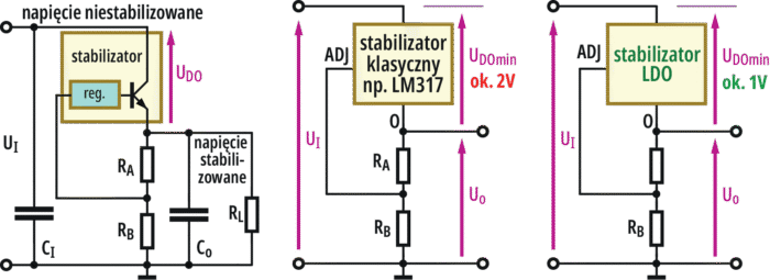 Już wcześniej przypomniałem, że w klasycznych zasilaczach liniowych stabilizacja polega na „obcinaniu nadwyżki napięcia” według rysunku 2. Pisałem też o tym, że dla zapewnienia prawidłowej pracy stabilizatora wymagane jest wystąpienie między jego wyjściem i wejściem napięcia (UDO), które nie może być niższe, niż określona dla danego stabilizatora jakaś wartość UDOmin.