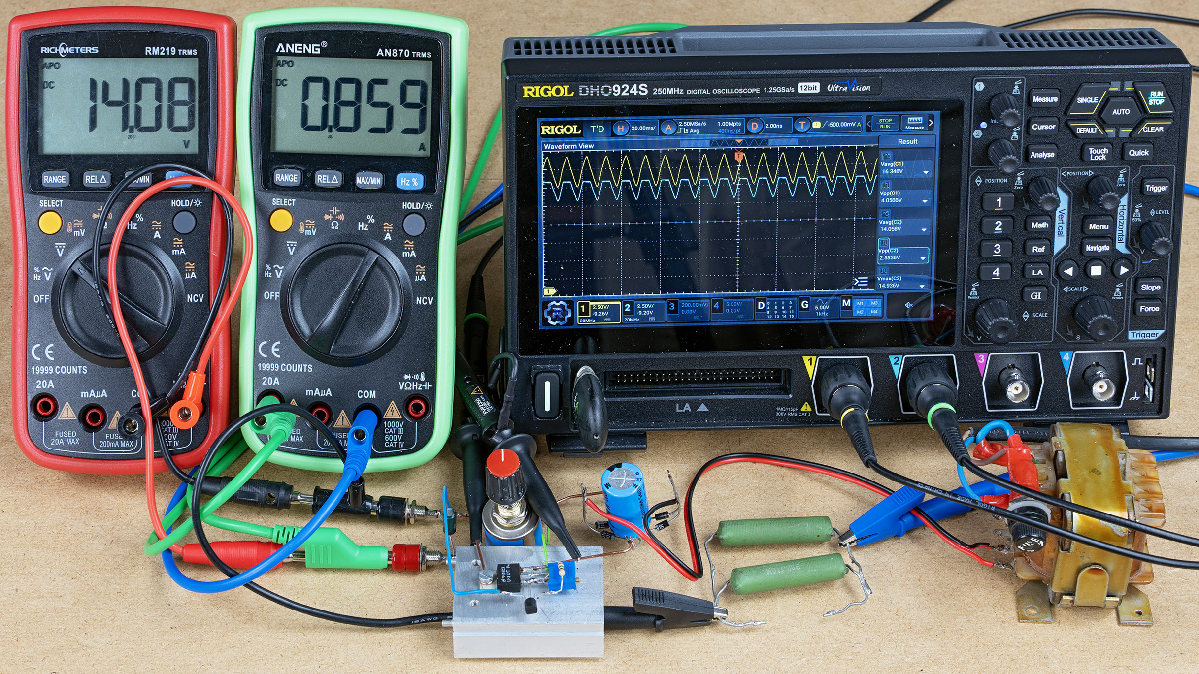 Bez obciążenia oczywiście udaje się na wyjściu uzyskać te 15 woltów, a nawet więcej. Ale przy pokazanym obciążeniu w postaci dwóch 33-omowych rezystorów i transformator, i stabilizator zdecydowanie sobie nie radzą! W napięciu wyjściowym widać duże tętnienia!
