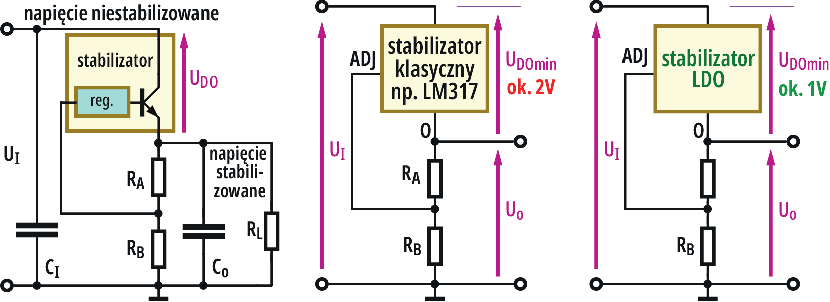 Już wcześniej przypomniałem, że w klasycznych zasilaczach liniowych stabilizacja polega na „obcinaniu nadwyżki napięcia” według rysunku 2. Pisałem też o tym, że dla zapewnienia prawidłowej pracy stabilizatora wymagane jest wystąpienie między jego wyjściem i wejściem napięcia (UDO), które nie może być niższe, niż określona dla danego stabilizatora jakaś wartość UDOmin.