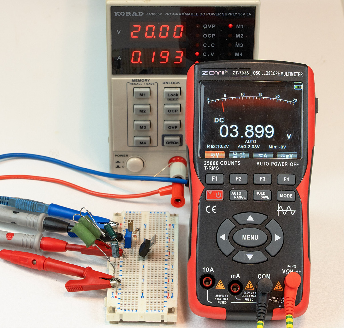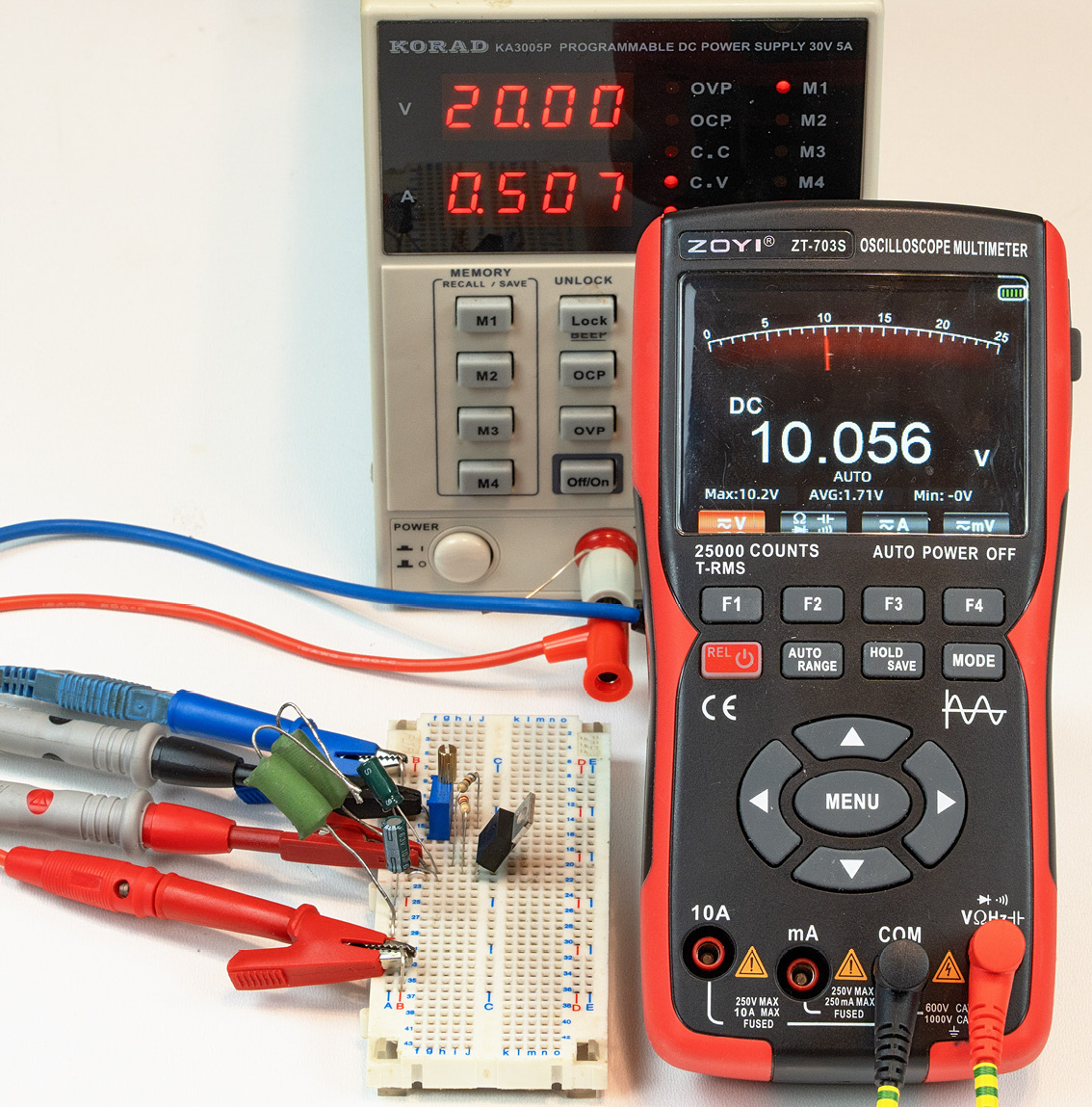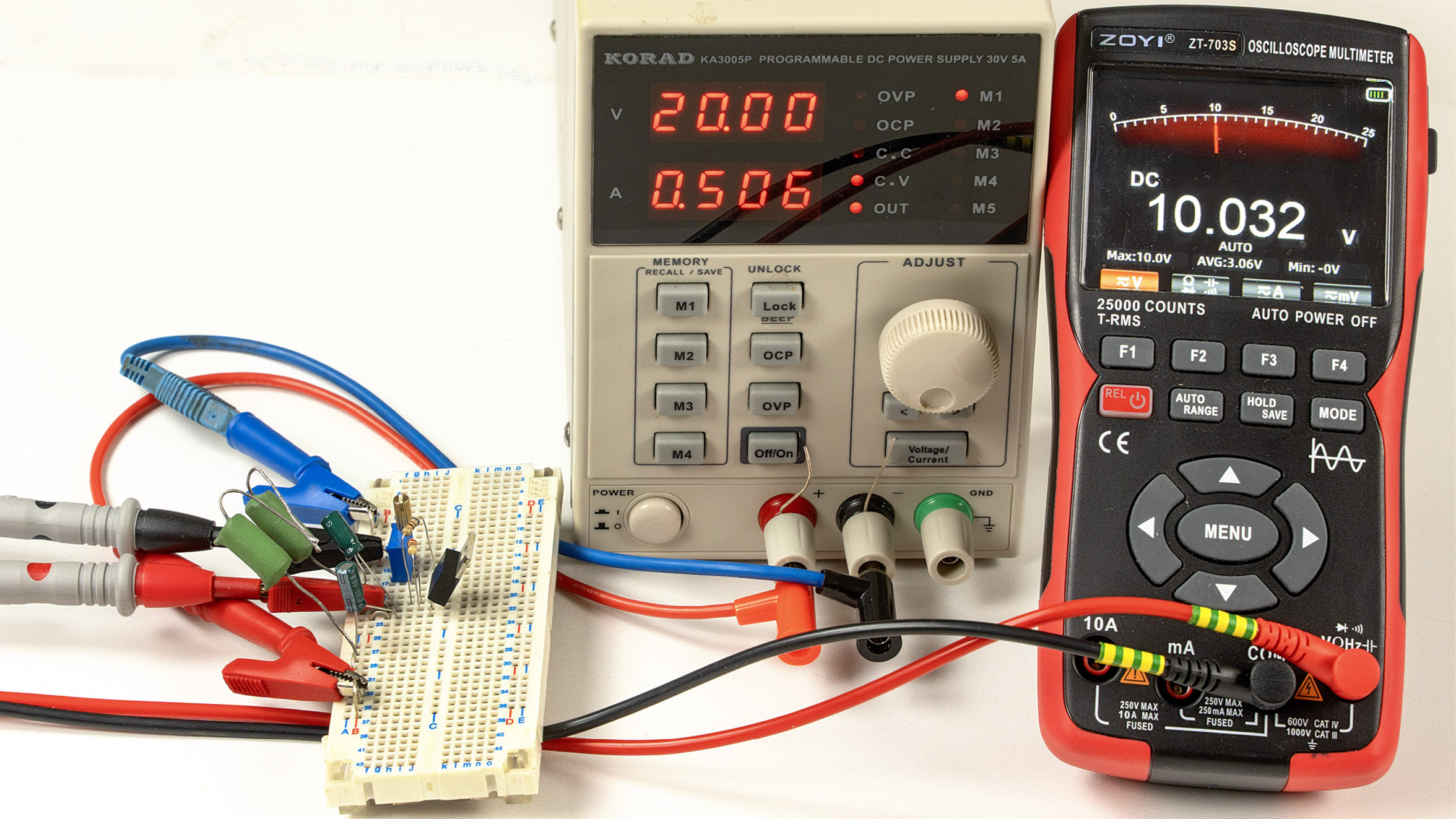 Bez radiatora kostka LM317 (i wszystkie podobne w obudowie TO-220) może bezpiecznie rozproszyć tylko około 2 watów mocy strat. Przykładowo przy napięciu wejściowym stabilizatora 20 V (i ustawieniu napięcia wyjściowego 10 V) i przy rezystancji obciążenia 20 omów, prąd ma początkową, prawidłową wartość około 0,5 ampera, co pokazuje fotografia 1 oraz fotografia tytułowa.