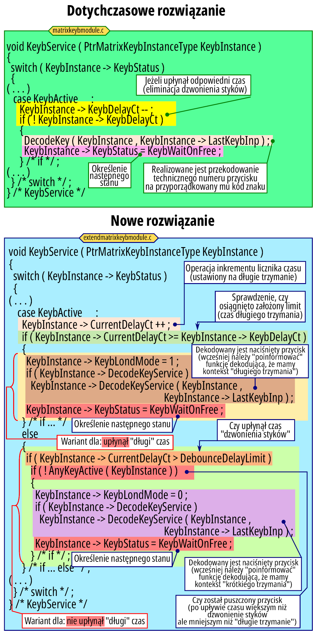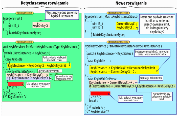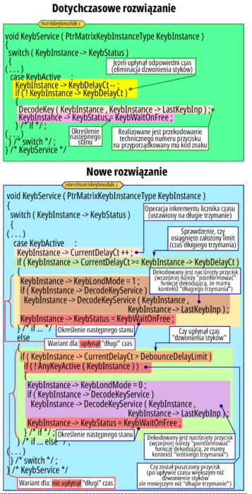 Oprócz tej zmiany zachodzi kilka modyfikacji w operacjach określania czasów trwania odpowiednich czynności oraz zmiany w stanie osiągnięcia stabilnego naciśnięcia przycisku. Dotychczas, po wstępnym wykryciu naciśnięcia przycisku do pokonania zjawiska dzwonienia styków był specyfikowany odpowiedni czas. W nowym rozwiązaniu następuje zmiana „sensu” wykonywanych operacji: odmierzany jest czas, po upływie którego oprogramowanie uznaje, że nastąpiło długie naciśnięcie przycisku zamiast „przetrwania” dzwonienia styków – rysunek 2 .