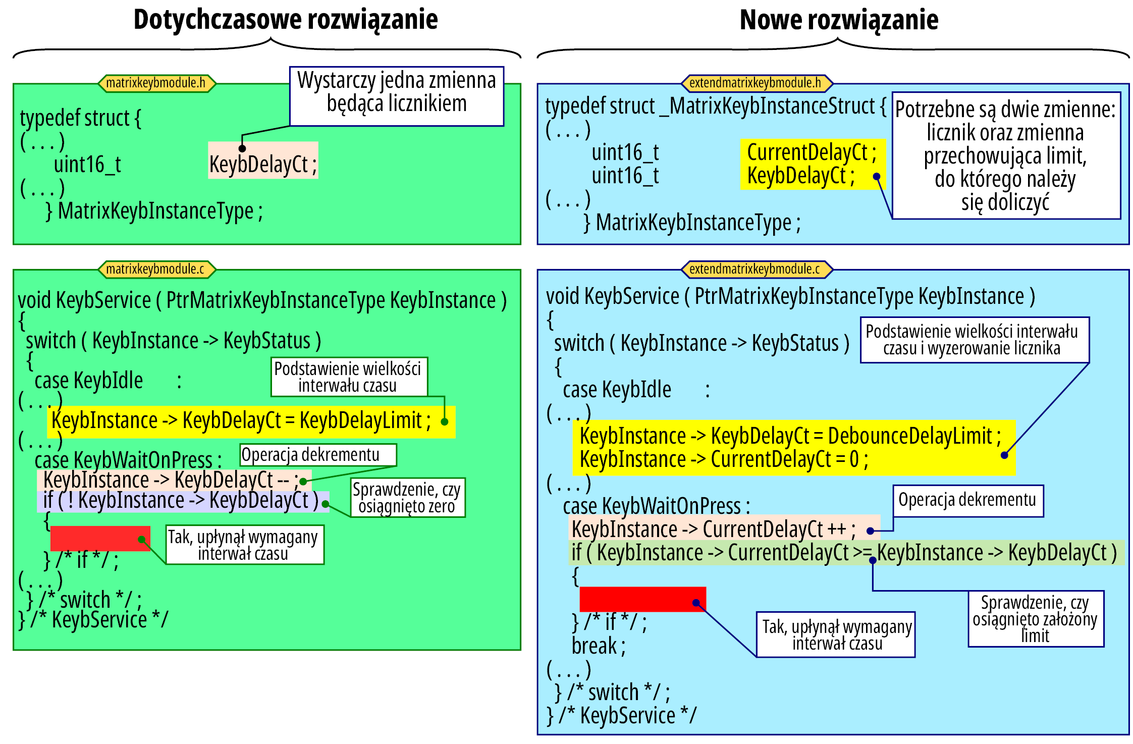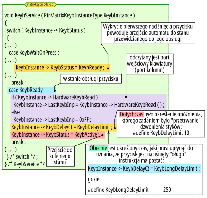 Wariant obsługi klawiatury opisany w poprzedniej części zostanie rozbudowany o nowe funkcjonalności. W swoim domu mam kilka urządzeń z „automatyki domowej”, w których rozróżniane jest standardowe naciśnięcie przycisku oraz naciśnięcie i przytrzymacie go przez znacząco dłuższy czas. W ten sposób można, bazując na jednym przycisku, uzyskać dwie funkcje. Kuchenny wentylator po każdym naciśnięciu zwiększa ciąg, inny przycisk zmniejsza i aby wyłączyć wentylator należy ileś razy zmniejszyć ciąg, by dojść do zera lub wykorzystać możliwość podwojenia funkcji: przytrzymanie pierwszego włącza maksymalny ciąg wentylatora, natomiast przytrzymanie drugiego wyłącza wentylator. Inną przydatną funkcją, która przykładowo jest typową w klawiaturach komputerowych jest autorepetycja. W samochodzie do ustawiania zegarka jest zastosowany jeden przycisk. Każdorazowe jego naciśnięcie przestawia zegarek o jedną minutę do przodu. Przy zmianie czasu, gdzie trzeba zegar cofnąć o jedną godzinę, takie klikanie to wręcz koszmar (przejść o 23 godziny do przodu). Na szczęście konstruktorzy dodali funkcję autorepetycji. Po pierwszym naciśnięciu (i przytrzymaniu) przycisku, po pewnym czasie zaczyna się on powielać w szybkim tempie. Takie funkcje są przydatne w konstruowanych urządzeniach.