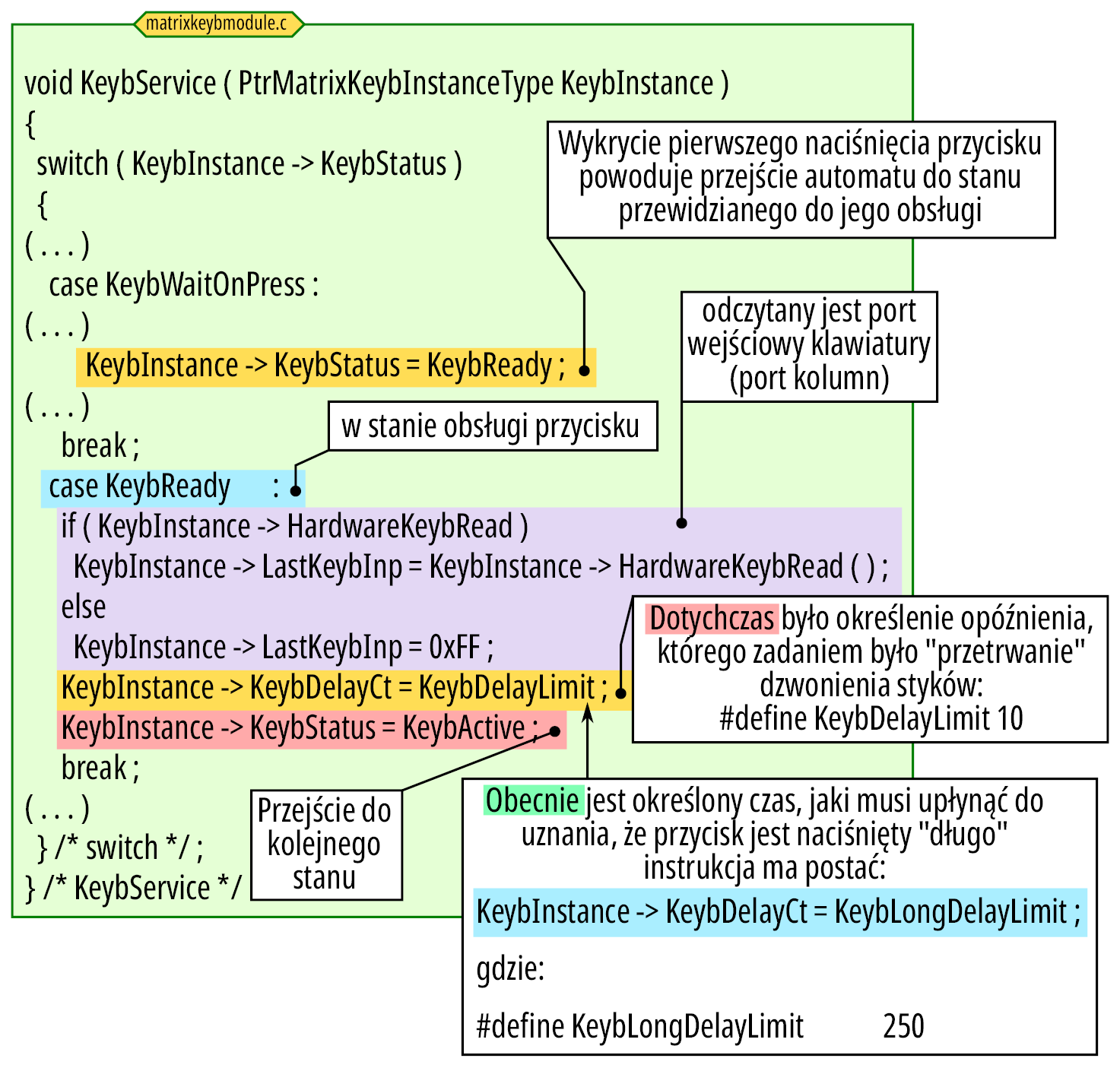 Jednak to zjawisko również musi zostać uwzględnione w programie i obecnie znajduje się w obrębie zainteresowania następnego stanu (rysunek 3 ), w którym (KeybActive), z założenia mierzony jest czas, po upływie którego program uznaje, że przycisk został naciśnięty „długo”.