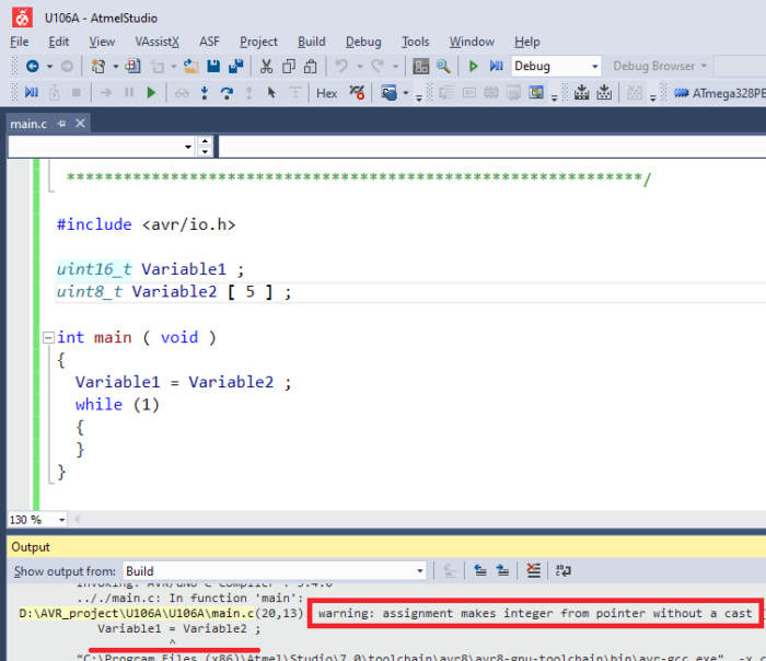 Następuje tu podstawienie do zmiennej typu 16-bitowej liczby bez znaku, tablicy pięcioelementowej. O dziwo, kompilator wygenerował kod dla takiego programu (nie dostrzegł tu błędów składniowych) a jedynie zgłosił uwagę w kategorii ostrzeżenia (ang. warning), jak widać na rysunku 1.