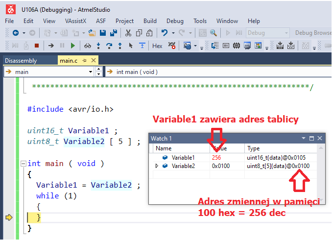 Sens tego komunikatu należy rozumieć jako próbę przypisania liczby całkowitej ze wskaźnika bez rzutowania. Wszystko brzmi trochę enigmatycznie. Otóż nie następuje tu przepisanie zawartości tablicy do zmiennej 16-bitowej. Tablica jako zmienna bez elementu indeksującego (podania w nawiasach [ ] numeru elementu) jest interpretowana jako wskaźnik (adres) do całej tablicy, w sumie liczba 16-bitowa, pokazuje to rysunek 2 – po uruchomieniu symulacji działania programu.