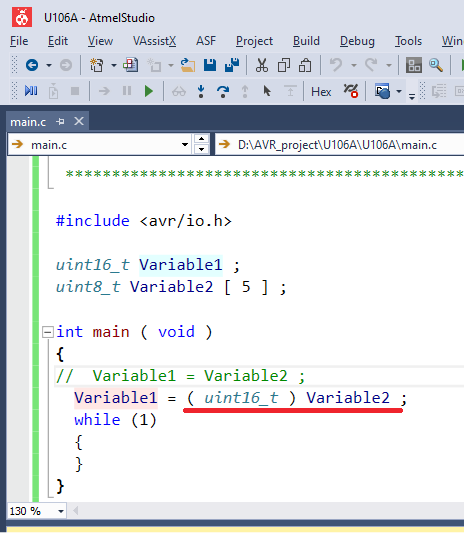 Z komunikatu ostrzeżenia została wyjaśniona kwestia wskaźnika (czyli adresu) – można podstawić do zmiennej adres dowolnego elementu z programu. Pozostaje jeszcze jego część bez rzutowania. W sytuacjach, gdy zachodzi konflikt reprezentacji, można wymusić odmienne traktowanie wartości. Należy przed wyrażeniem dodać ujęty w nawiasy identyfikator typu, na jaki ma „to być przetłumaczone”. Poprawny zapis (taki, gdzie kompilator nie zgłosił żadnych uwag) przedstawia rysunek 3.