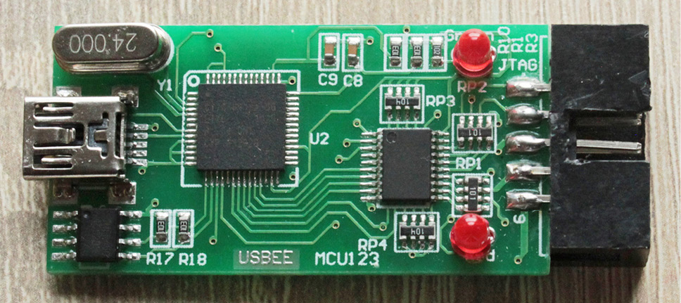 Warto przyjrzeć się rozwiązaniom sprzętowym zastosowanym w analizatorze Saleae. Otwierając pudełeczko czytnika można dostrzec układ mikrokontrolera w obudowie QFP, który zajmuje się komunikacją samego czytnika z komputerem PC oraz bufor wejściowy w obudowie SO20 (fotografia 4).