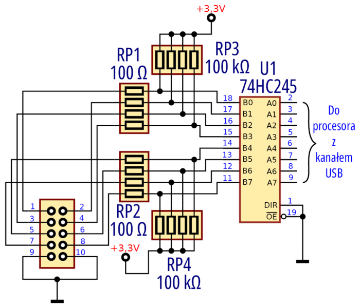 Istnieją wersje uboższe, zawierające jedynie sam mikrokontroler. Obwody wejściowe czytnika pokazuje rysunek 5 (uzyskany jako reverse engineering). Wynika z niego, że czytnik nie przetwarza sygnałów o charakterze analogowym (74HC245 przenosi jedynie sygnały o cechach cyfrowych: strome zbocza i amplituda typowa dla układów logicznych). Właściwie jest on dedykowany systemom o zasilaniu 3,3 V, ale rozwiązania w stopniach wejściowych pozwalają „podłączyć” się do logiki 5 V. Wszystkie wejścia czytnika pozostawione jako „wiszące w powietrzu” będą interpretowane jako jedynka logiczna – ta cecha wynika z rozwiązań stopnia wejściowego.