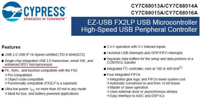 Drugim elementem jest mikrokontroler, układ o symbolu CY7C68013. Z dostępnej dokumentacji wynika, że jest to ulepszony mikrokontroler z rodziny C51 (rysunek 6).