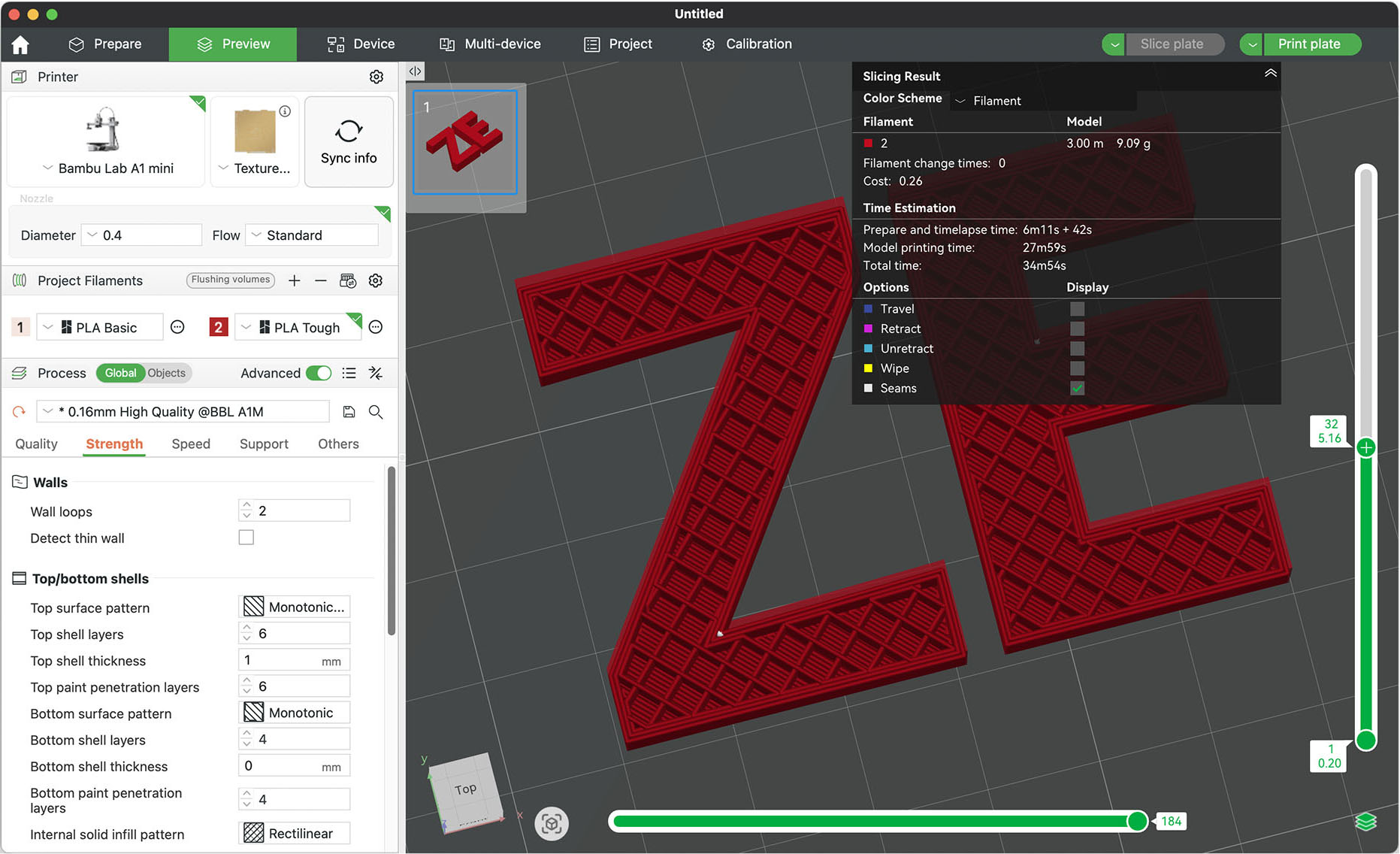 Następny krok to wygenerowanie „przepisu” na wydruk – robi to za nas program, a efekt jego działania jest na rysunku 2. Oprócz możliwości zajrzenia „do środka” wydruku, podaje nam też szacunkowy czas drukowania i potrzebną ilość materiału.