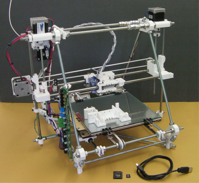 Na zdjęciu tytułowym widzimy „ojca” projektu RepRap, który w zasadzie zapoczątkował rewolucję druku 3D po wygaśnięciu pierwszych patentów. Jest nim dr Adrian Bowyer – matematyk z brytyjskiego Uniwersytetu w Bath, który opracował i udostępnił pierwszą drukarkę 3D dostępną na zasadach Open Source. Jego celem było w zasadzie zbudowanie urządzenia, które może się samo replikować, czyli być w stanie wyprodukować swoją kopię (stąd nazwa projektu RepRap) a drukarka 3D miała być tylko początkowym etapem jego pracy. Jednak wyszło mu to na tyle dobrze, że bardzo szybko po opublikowaniu dokumentacji, nastąpiła eksplozja drukarek tego typu na całym świecie. Na tym zdjęciu, z 28 maja 2008 roku, widzimy dr. Bowyera wraz z pierwszą zbudowaną przez niego drukarką (parent) oraz wydrukowaną przez nią kopią (child) – oczywiście nie była to pełna kopia, trzeba było dodać trochę metalowych prętów, innych niedrukowalnych elementów oraz elektronikę sterującą (opartą na znanych chipach ATmega), ale cała reszta była wydrukowana przez pierwszą drukarkę. Ta idea oraz otwierające się możliwości były tak pociągające, że nagle ludzie na całym świecie zaczęli budować drukarki i ulepszać ten projekt – notabene w ten sposób powstało wiele znanych w tej branży firm, m.in. „wielka trójka”, czyli Prusa 3D w Czechach, Ultimaker w Holandii i MakerBot w USA. Muszę przyznać, że niedługo później sam „wsiąknąłem” w projekt RepRap a pierwszą drukarką, którą zbudowałem była kolejna iteracja drukarki dr. Bowyera – RepRap Mendel (fotografia 1, którą mam do dzisiaj i to w wersji posiadającej trzy głowice!