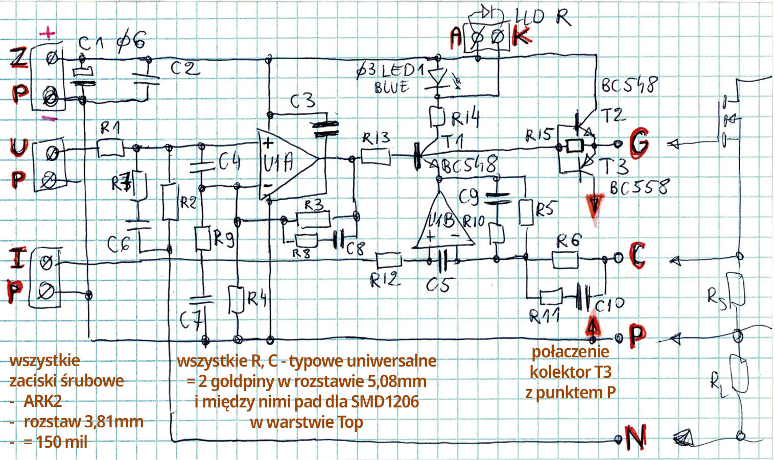 Będziemy realizować projekt według odręcznego rysunku 1. Zanim jednak zaczniemy rysować schemat, przedstawię niezbędne informacje dotyczące KiCada, m.in. odnoszące się do rysunków zrzutów ekranowych. Otóż program cechują duże, a wręcz ogromne okna dialogowe. Aby nadmiernie nie zwiększały objętości tego artykułu, niektóre z nich są skadrowane i pokazują tylko to, co najważniejsze.
