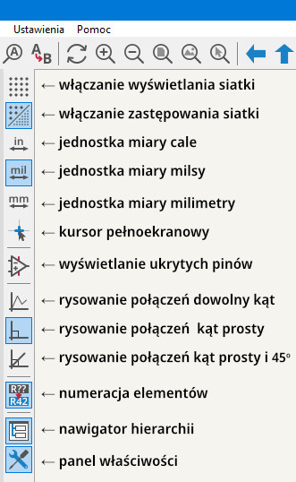Po uruchomieniu edytora schematów po jego lewej stronie mamy widoczny panel podzielony na trzy sekcje. Hierarchię schematów, Właściwości oraz Filtr wyboru. Panele te możemy wyłączyć poprzez kliknięcie na dwóch najniższych ikonkach lewego paska narzędziowego, Nawigator hierarchii i Panel właściwości. Funkcje lewego paska narzędzi opisane są na rysunku 2.