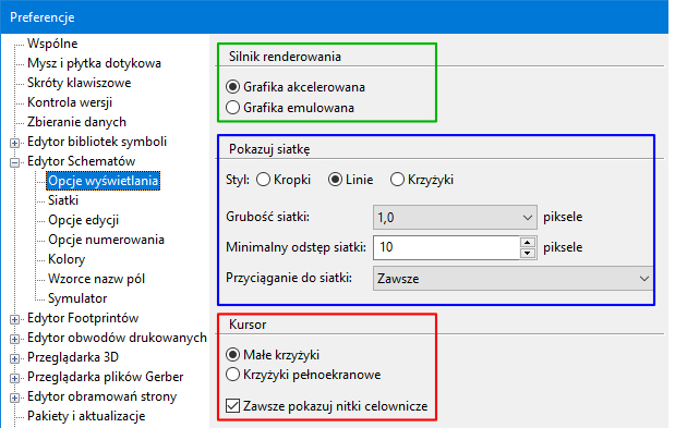Może być on standardowy lub pełnoekranowy na podobieństwo układu współrzędnych. Styl kursora możemy przełączać na lewym pasku narzędziowym. Niestety tłumaczenie funkcji z czerwonej ramki jest niezbyt poprawne. Zwróćmy jeszcze uwagę na zieloną ramkę, gdzie powinna być włączona grafika akceleratorowa, czyli funkcje rysowania grafiki KiCada są wspierane przez kartę graficzną.