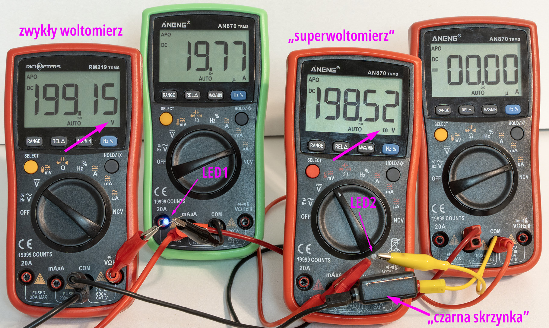 Pokazany jest tu pomiar napięcia stałego około 200 V. Multimetr z lewej strony to zwykły woltomierz (RM219 = ZT219), ma rezystancję wewnętrzną około 10 megaomów i mierzy napięcie w klasyczny sposób. W obwód dodatkowo włączyłem szeregowo niebieską diodę LED1 i zielony mikroamperomierz. Jak widać, płynie przez nią prąd około 20 mikroamperów, który powoduje zaskakująco jasne jej świecenie. Trzeci multimetr jest „superwoltomierzem” i mierzy to samo napięcie. Także i tu w szereg włączyłem diodę LED2, ale absolutnie nie widać jej świecenia i mikroamperomierz – czwarty miernik – pokazuje zero. W obwodzie pomiarowym też zapewne płynie jakiś prąd, ale tak mały, że tak czuły mikroamperomierz go nie wykrywa. Dzięki prostemu dodatkowi rezystancja wewnętrzna takiego „superwoltomierza” jest ogromna. Miernik pracuje jako miliwoltomierz, a wysokoomowy dzielnik ma stopień podziału 1000:1. Miernik podaje wynik w miliwoltach, ale przy obecności dzielnika 1000:1 niczego nie trzeba przeliczać – napięcie wyrażone jest w woltach. Wskazania „zwykłego woltomierza” oraz „superwoltomierza” (199,15 V, 198,52 V) różnią się, ale tylko o około 0,3 procent, czyli bardzo niewiele!