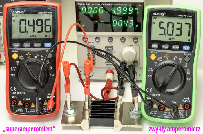 Fotografia 2 pokazuje „superamperomierz” –czerwony miernik współpracujący z zewnętrznym bocznikiem. Zasilacz Korad KKG305P pracuje w trybie prądowym CC i jego wskaźnik pokazuje wartość 4,999 A. Zwykły amperomierz z prawej strony pokazuje prąd 5,037 A, czyli o niecałe 0,8% więcej. „Superamperomierz” ma wskazanie 0,496 miliwolta (tak! 0,000496 V) i mniej więcej tak znikomo mały jest spadek napięcia na samym boczniku. Bocznik jest 750-amperowy o typowym spadku napięcia 75 mV, czyli ma rezystancję 0,1 milioma (0,0001 Ω), dlatego wynik trzeba pomnożyć przez 10.