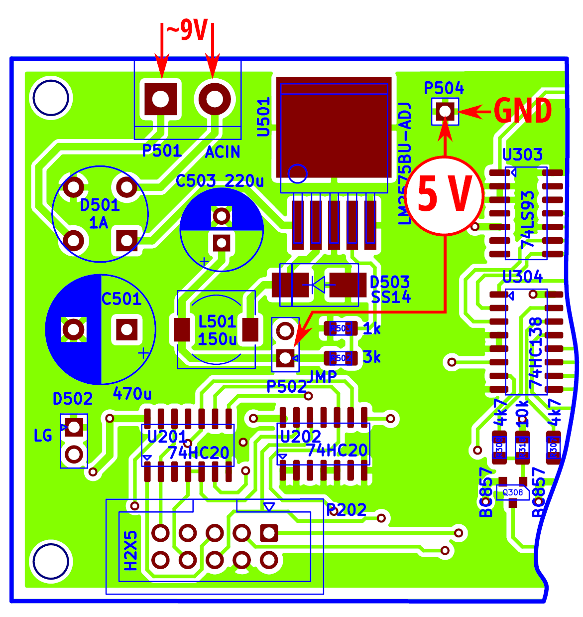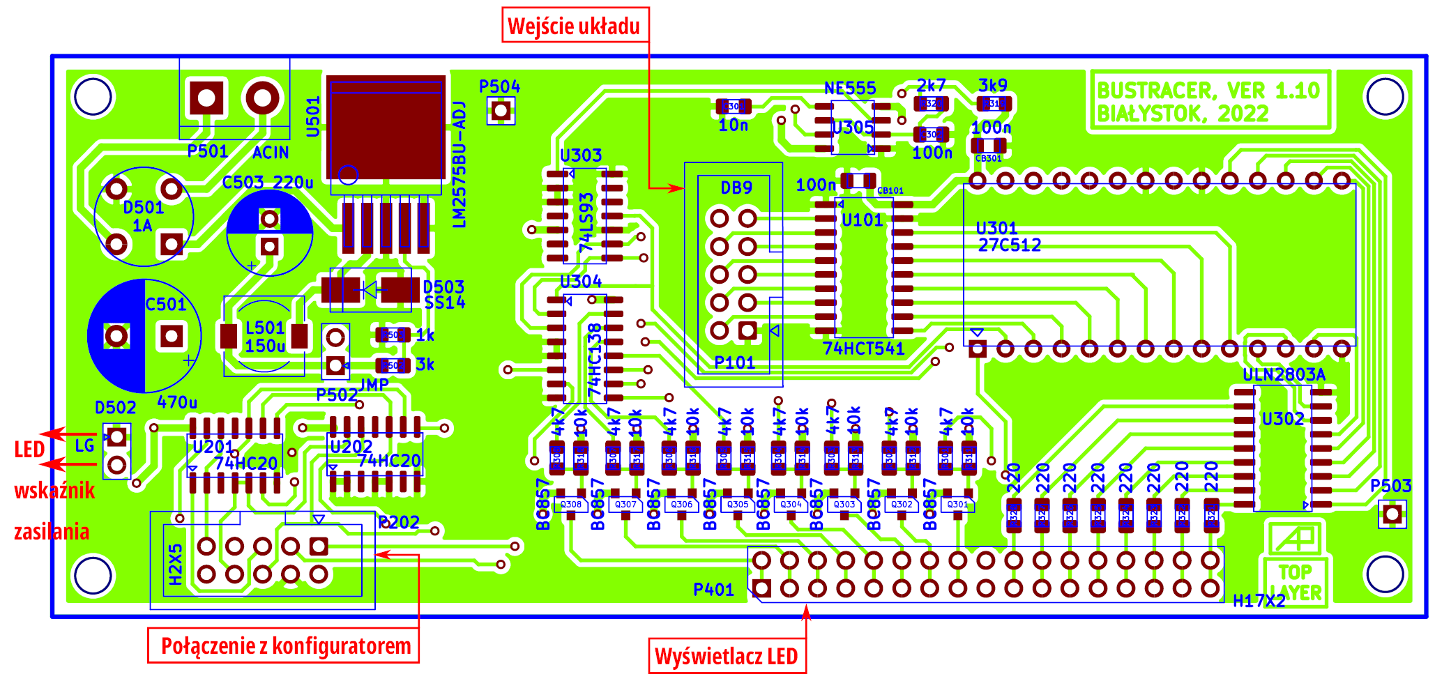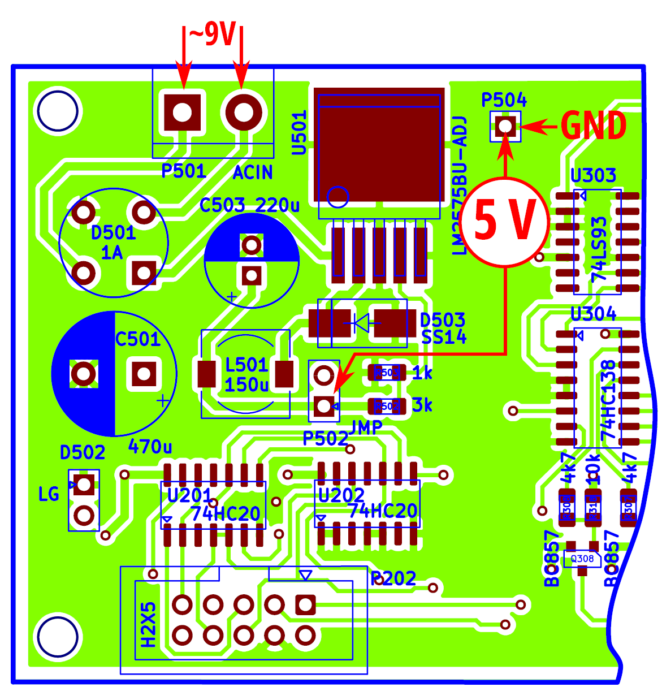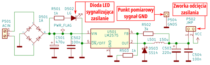 Po przyłączeniu transformatora (złącze P501) należy zmierzyć napięcie między P504 (punkt odniesienia do pomiarów) a pin 1 w P502 (wyjście zasilacza), jak pokazuje rysunek 2. Przy poprawnym napięciu zasilającym +5 V (możne ono się różnić o kilkaset mV z uwagi na tolerancję rezystorów R502 i R503 – rysunek 1) można na stałe wlutować zworkę P502. przeciwnym wypadku koniecznością jest sprawdzenie połączeń w obrębie zasilacza (pomijam przypadek pomylonych elementów).