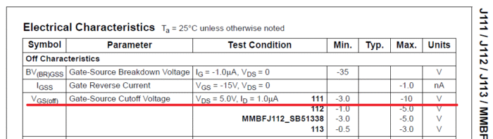 W stopniu wejściowym zostały zastosowane tranzystory JFET (o symbolu J111). Są to tranzystory JFET z zubożonym kanałem N (tak jak tranzystory bipolarne dzielą się na npn oraz pnp, tranzystory polowe dzielą się na te z kanałem typu N i typu P). Tranzystor z kanałem zubożonym (w przeciwieństwie do tranzystorów z kanałem wzbogaconym) oznacza, że przy braku wysterowania wyprowadzenia bramki, tranzystor przewodzi (między drenem z źródłem płynie prąd). Aby powstrzymać przepływ prądu, należy między bramkę a źródło doprowadzić napięcie ujemne. Dla użytego J111 to napięcie odcięcia bramka – źródło wynosi –3…– 10 V (jak pokazuje rysunek 1).