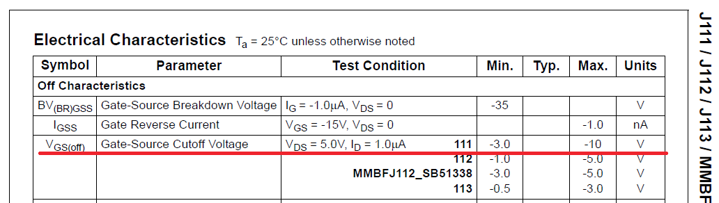 W stopniu wejściowym zostały zastosowane tranzystory JFET (o symbolu J111). Są to tranzystory JFET z zubożonym kanałem N (tak jak tranzystory bipolarne dzielą się na npn oraz pnp, tranzystory polowe dzielą się na te z kanałem typu N i typu P). Tranzystor z kanałem zubożonym (w przeciwieństwie do tranzystorów z kanałem wzbogaconym) oznacza, że przy braku wysterowania wyprowadzenia bramki, tranzystor przewodzi (między drenem z źródłem płynie prąd). Aby powstrzymać przepływ prądu, należy między bramkę a źródło doprowadzić napięcie ujemne. Dla użytego J111 to napięcie odcięcia bramka – źródło wynosi –3…– 10 V (jak pokazuje rysunek 1).